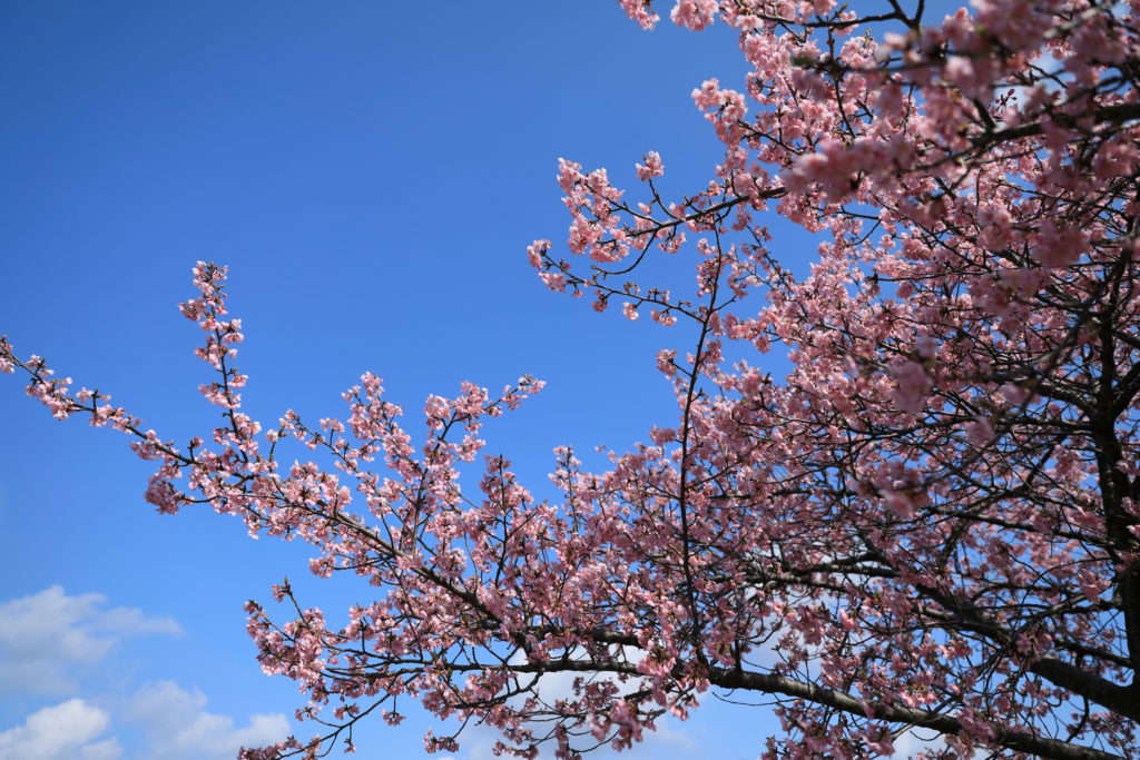 葉桜にはなっていないものの、満開を過ぎた大きい河津桜の木が並んでいます。