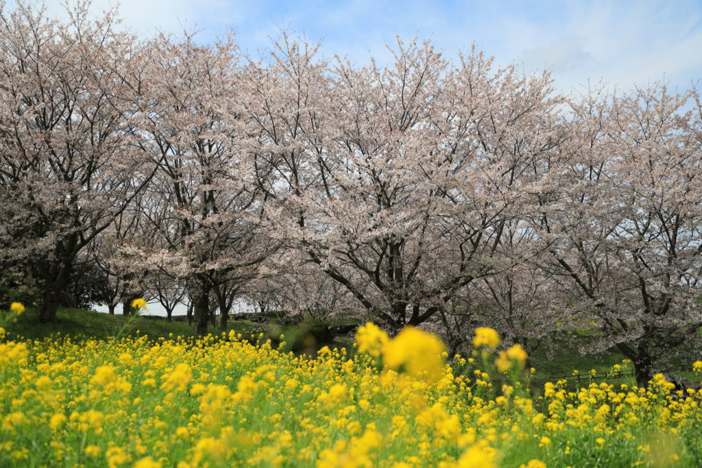 ここは満開のソメイヨシノのさくらと菜の花の黄色、緑の葉のコラボ。最高である。気温22度5月のような天候に恵まれ、風も気持ちが良い。