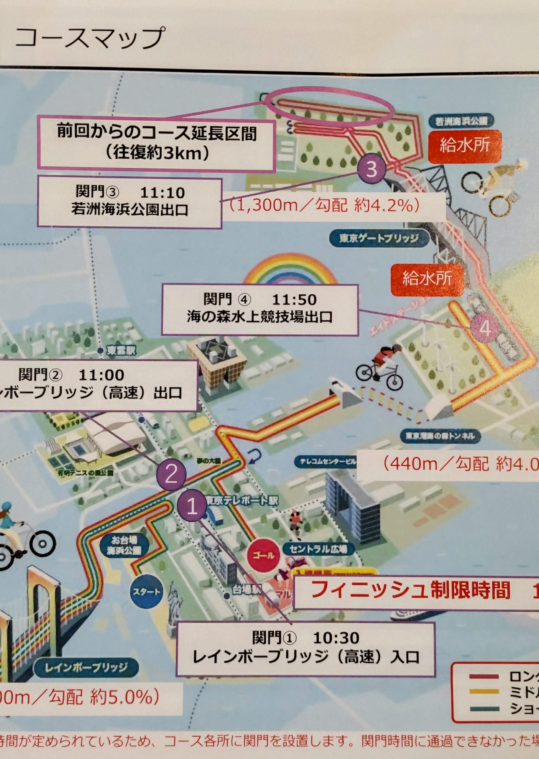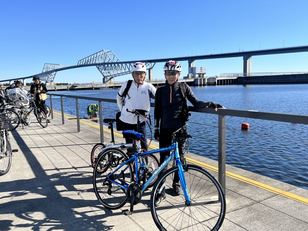 集合場所からスタートまでは徒歩で30分ほど自転車を押し歩きましたが、わくわく、どきどきしながらスタート地点のお台場海浜公園へ。ブロックごとにスタート及びランは分けられていましたが、スムーズにスタート。いきなりレインボーブリッジの入口。勾配4%1200m登り、橋の中央付近でUターン。ここからは快走。景色も上から見る湾岸エリアと東京都心。最高爽やか。そして、海に潜るトンネル。ここは下りから、そして今度は400m勾配4%登り。最近電動アシスト車もあり、乗っている人も多数。登りきった時の達成感はこのマニュアルにはかわない。東京ゲートブリッジの見える海の森水上競技場で休憩。約12km走った。写真を撮ってくれるサービスやドリンクサービスもある。グループやお一人様に声をかけて写真を取ってあげると喜ぶ。また、それを見ていたグループから声がかかる。一期一会の楽しいコミュニティ。