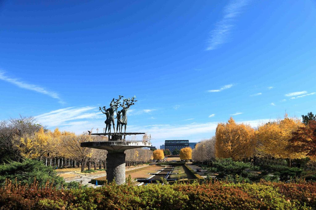 以下は昭和記念公園のサイトからカナールの説明です。立川口ゲートを入ると、真っ先に目に飛び込んでくるのは、このカナールです。カナールは造園用語で「修景手法のひとつで細長い直線水路」を意味しています。全長200mの水路には大小5つの噴水があり、その両側には合計106本のイチョウが左右対称に2列ずつ植栽されています。 このイチョウは基地時代に植栽されたものを移植したもので、開園からの年月を経て見事な緑の回廊へと成長を遂げました。 秋には黄葉が美しく、昭和記念公園の二大黄葉スポットの一つとなっています。
